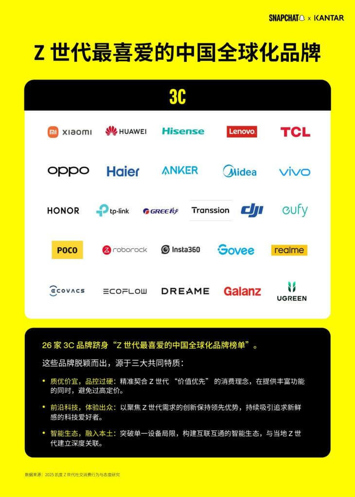 Recently, Snapchat and Kantar jointly released the first-ever “Top 50 Chinese Global Brands Favored by Gen Z” list. Among the brands listed, 26 are consumer electronics brands, 9 are gaming brands, 7 are e-commerce brands, and 8 are new energy vehicle brands. Tencent Games, Xiaomi, and SHEIN stood out, ranking in the top three.